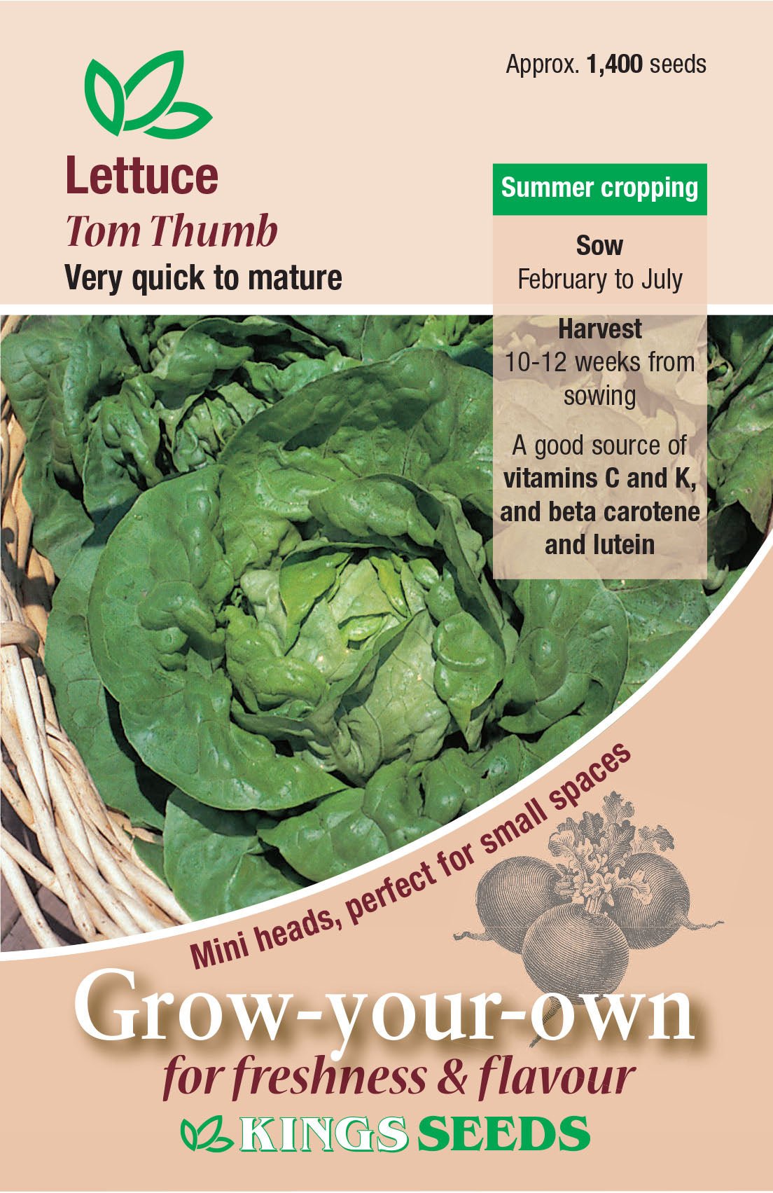 Tom Thumb is a very quick maturing variety, producing small but very solid heads with terrific flavour and nice texture. Sow early under cover and up to June only. Sow Feb to July