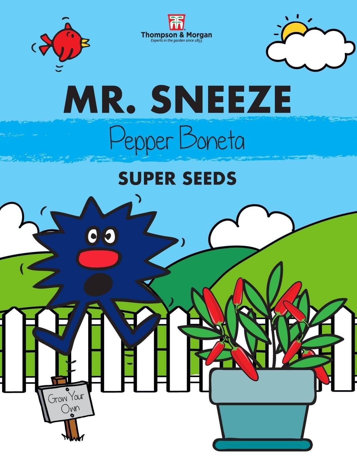 Mr. Sneeze just doesn�t stop sneezing! I have to watch out in case he steps on me when he sneezes. He likes growing things nice to eat in his garden, but he has to be careful not to sneeze the seeds away before he has time to sow them!